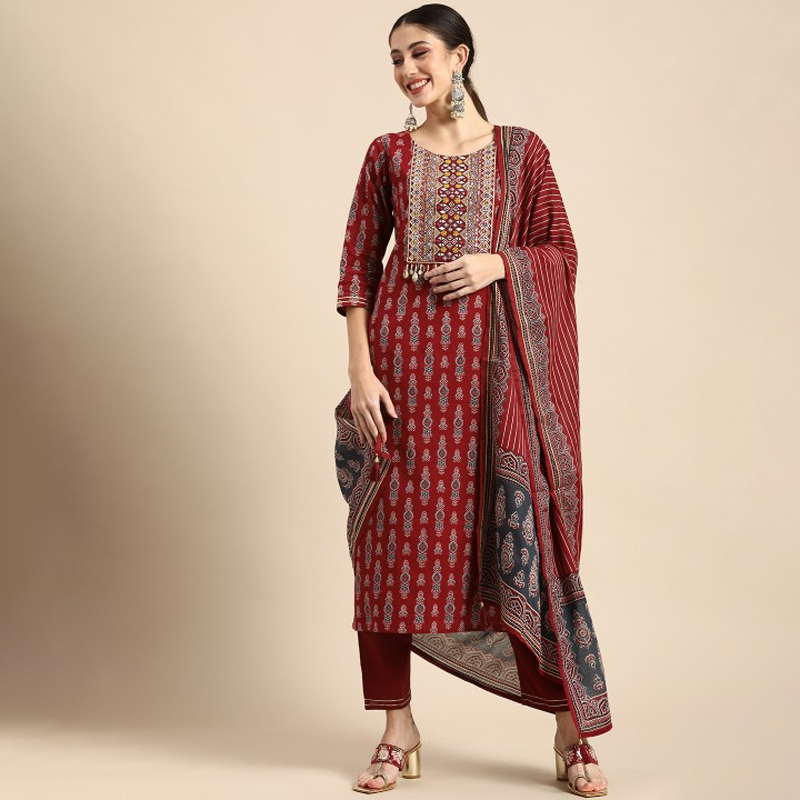 Ethnic Motifs Printed Pure Cotton Straight Kurta With Salwar & Dupatta