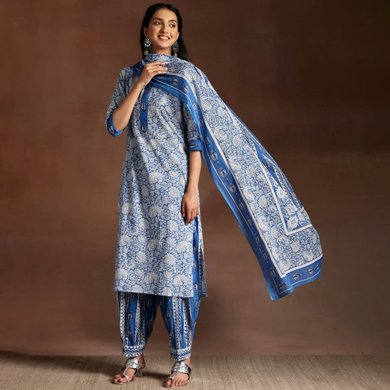Blue Floral Printed Round Neck Pure Cotton Straight Kurta With Salwar & Dupatta
