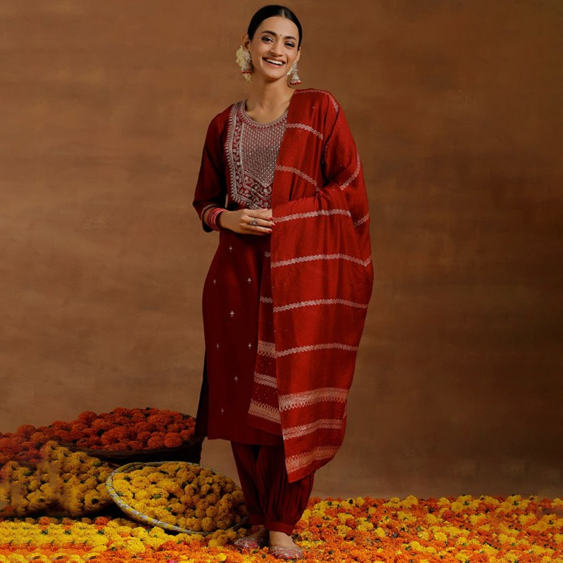 Women Red Ethnic Motifs Embroidered Pure Cotton Kurta with Salwar & With Dupatta