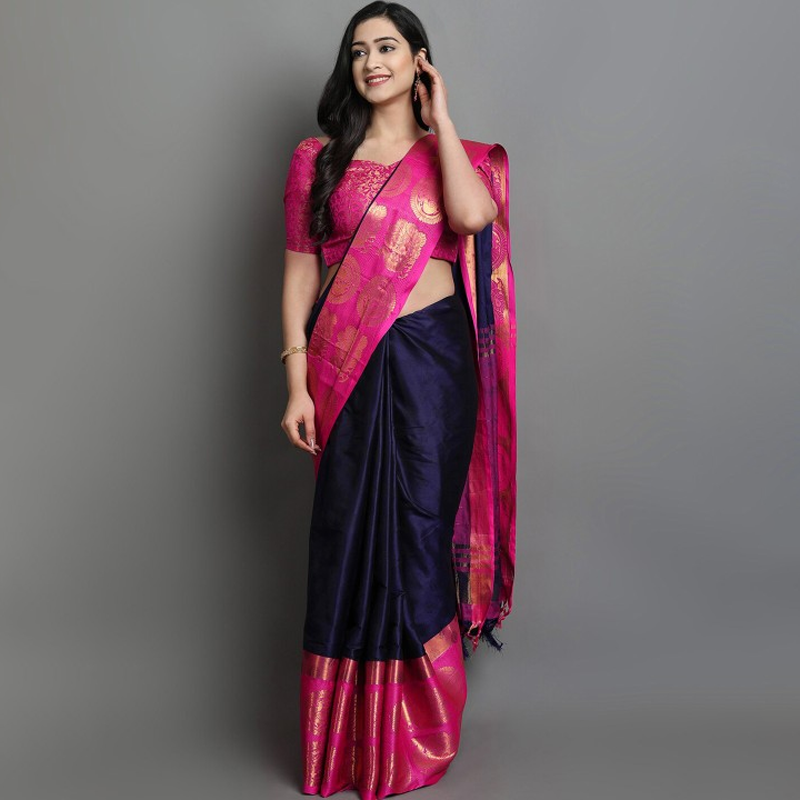 Navy Blue & Fuchsia Woven Design Zari Silk Cotton Saree